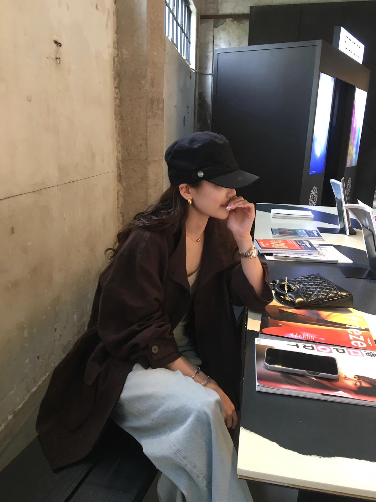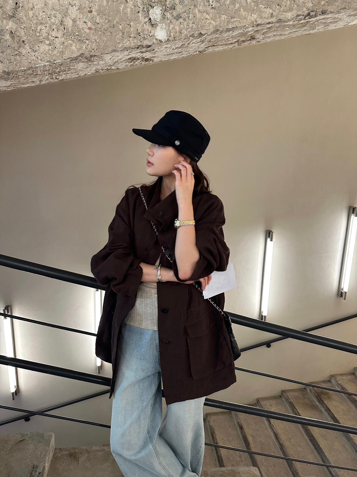 BLUEPOPS-Autumn New 100 Linen Large Pocket Stand Collar Mid-Length Windbreaker a5669